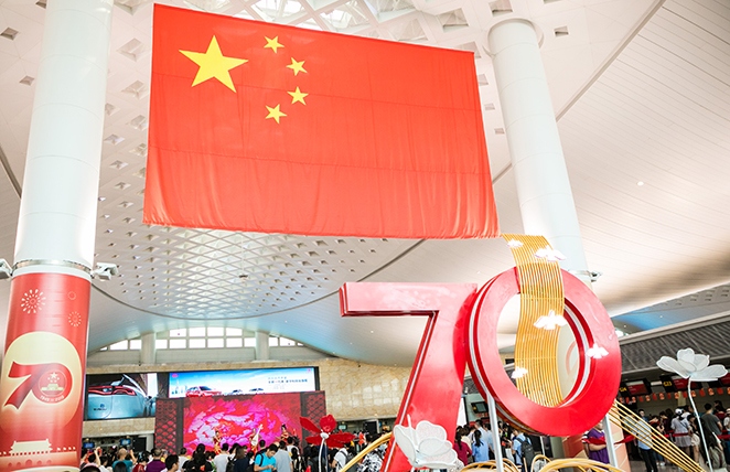 为庆祝新中国成立70周年,9月中旬,在T1、T2、T3航站楼出发层悬挂巨幅国旗、陈设国庆景观布展,吸引了大批出行旅客合影留念,进一步充实楼内丰富多彩的国庆节日氛围。9月30日上午,航站区中心联合各单位在T3航站楼出发大厅举办以“这一抹中国红”为主题的国庆文艺汇演。演出现场精心呈现了歌曲演唱、舞蹈表演、乐器演绎等10个表演节目,激扬的歌声、优美的旋律、动人的舞蹈和有趣的知识问答互动,吸引了旅客驻足观赏,共同庆祝新中国成立70周年,为祖国的繁荣昌盛送上最真挚的祝福。