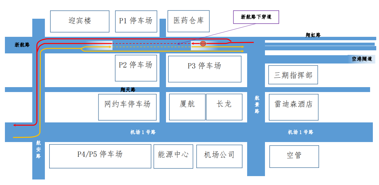 2023 年 7 月 3 日起,本场浙航路(原 13 号路)下穿道 (由东向西)封闭施工,有通行需求的车辆可在浙航路地面道路行驶(详见附图)。 请过往机动车依照相关交通标志、标线谨慎行驶,服从 现场管理人员指挥,共同确保机场交通的安全、有序、畅通。